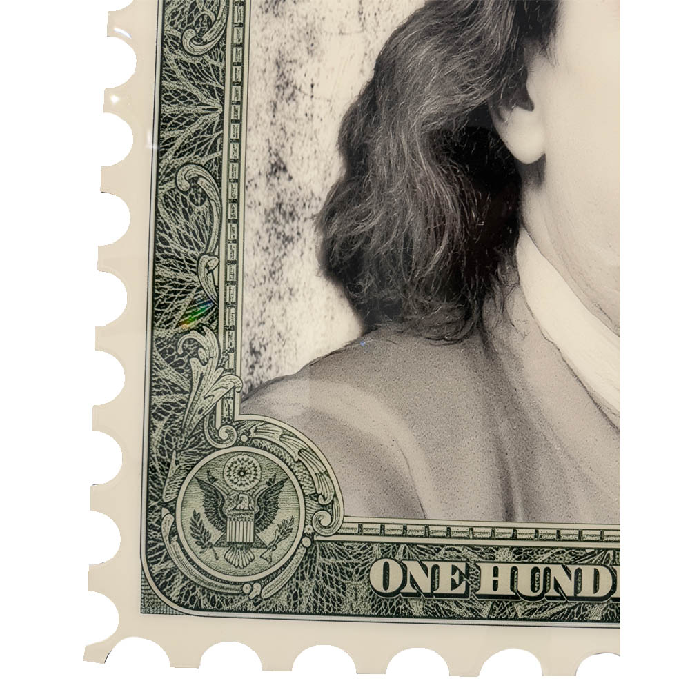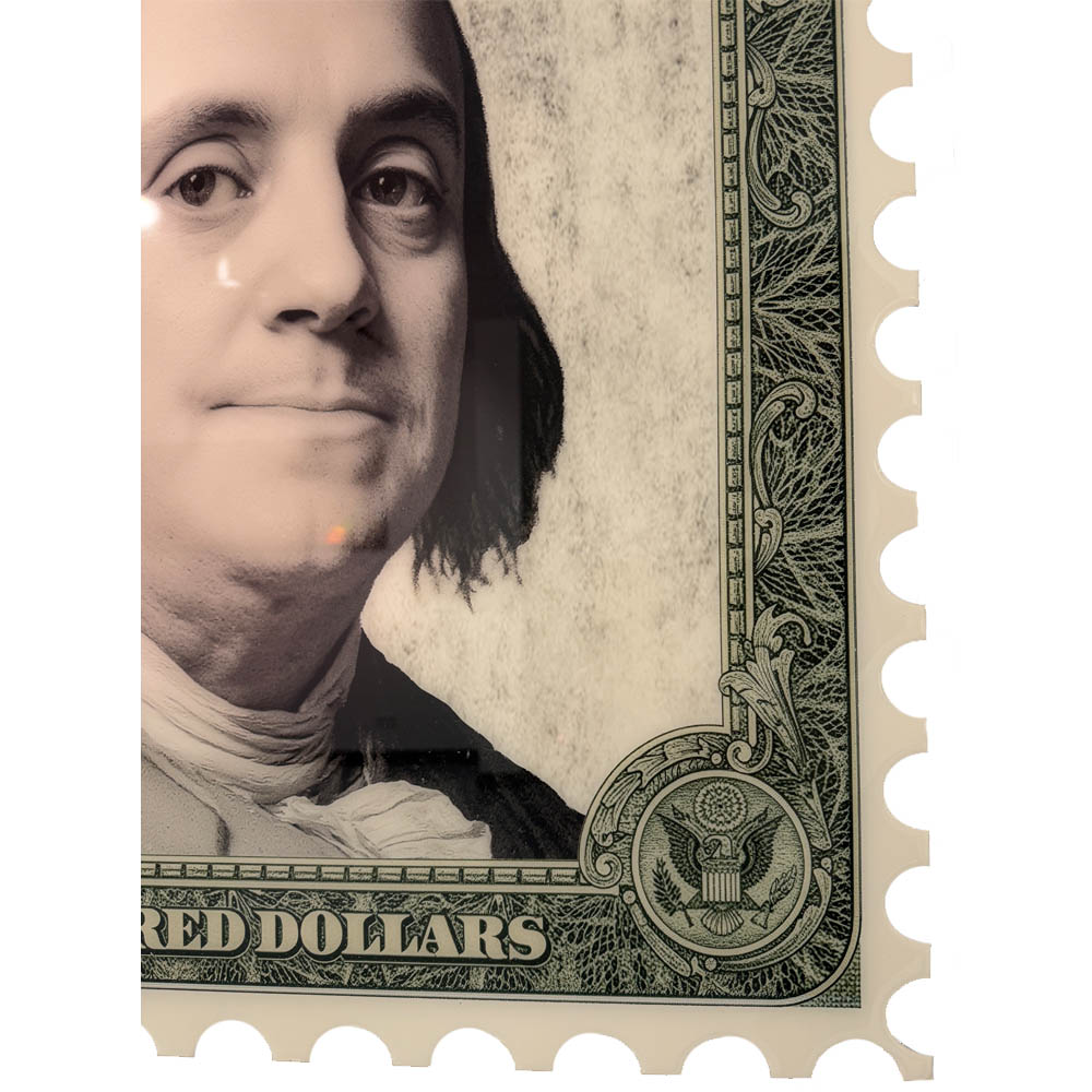 The Presidential Stamp ‘Benjamin’ is an amazing new serie of  Van Apple his latest creations. The stamp has been cut in a traditional version of a stamp. Combined with the epoxy, which the artworks have been covered over in multiple layers and the handmade shapes it creates a true nostalgic and artistic artwork