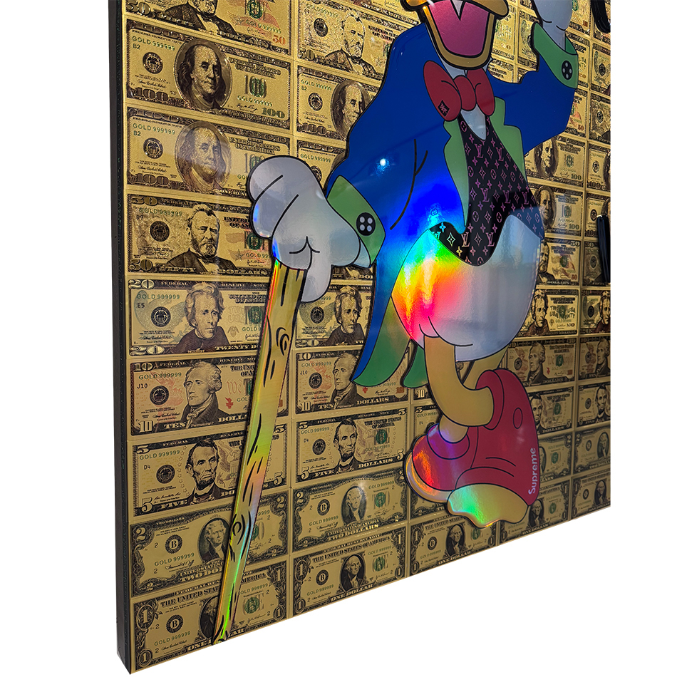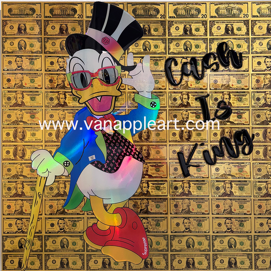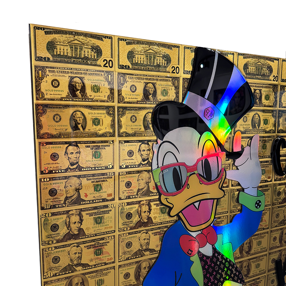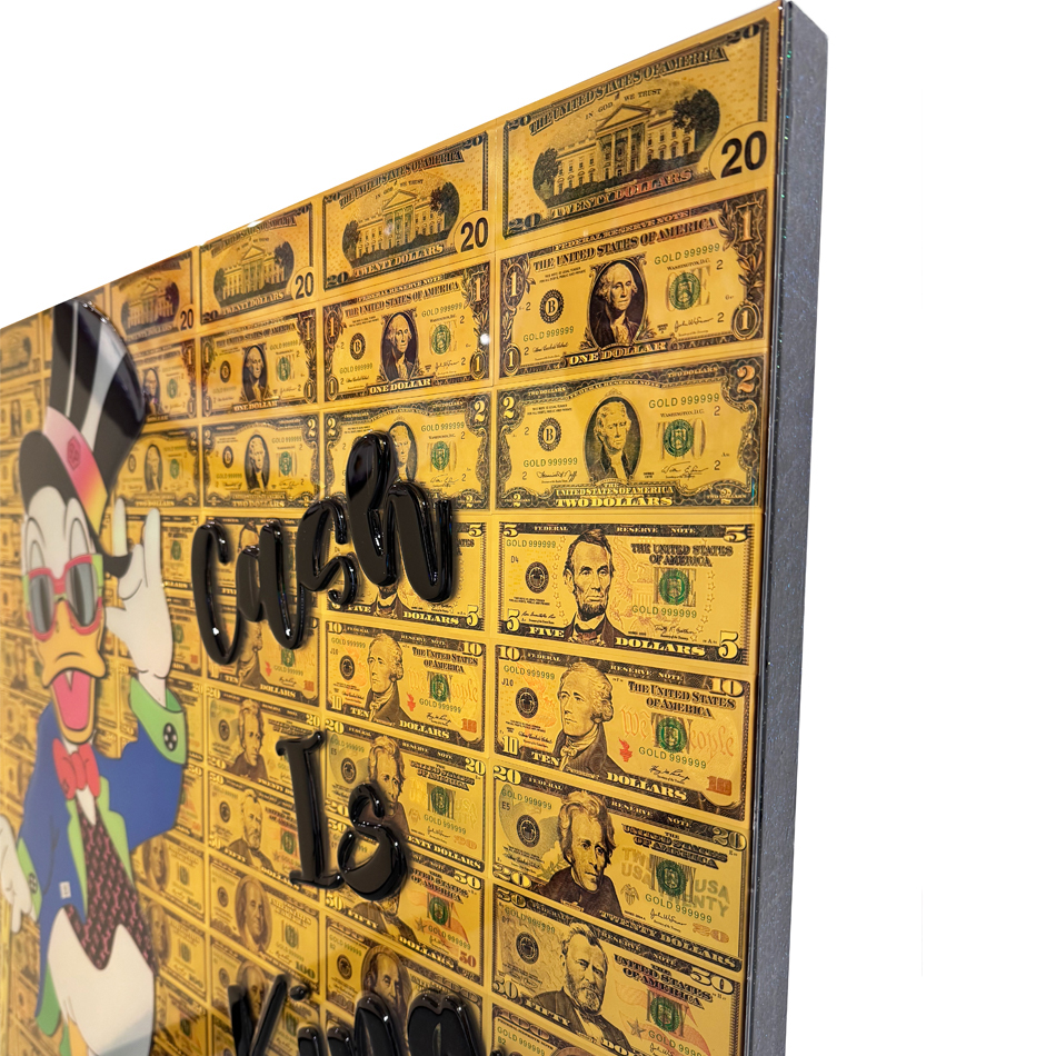 Amazing new release named: Cash is King! On the artwork gold pressed aluminium $notes have been added by hand on a aluminium frame. Later Van Apple added the hologram Scrooge McDuck, two Gold Bars, the cut out text and covered the work in 3/4 layers of epoxy. By adding these layers, the colors get a stunning effect and even the sides of the glitter box are amazing.