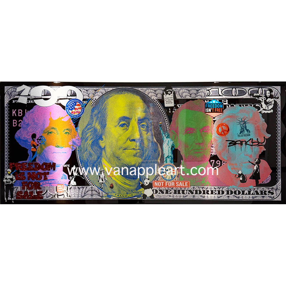 Amazing new artwork ”Freedom is Not for Sale” created by Van Apple in a humoristic way. Van Apple finished the artwork with red glitters and covered the artwork in 3/4 layers of epoxy. By adding these layers, the colors get a stunning effect.